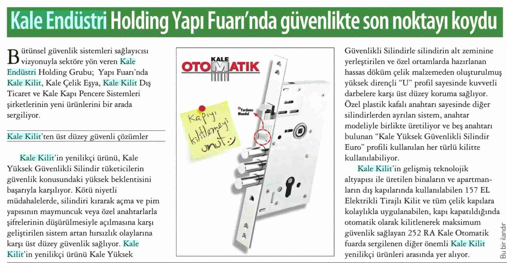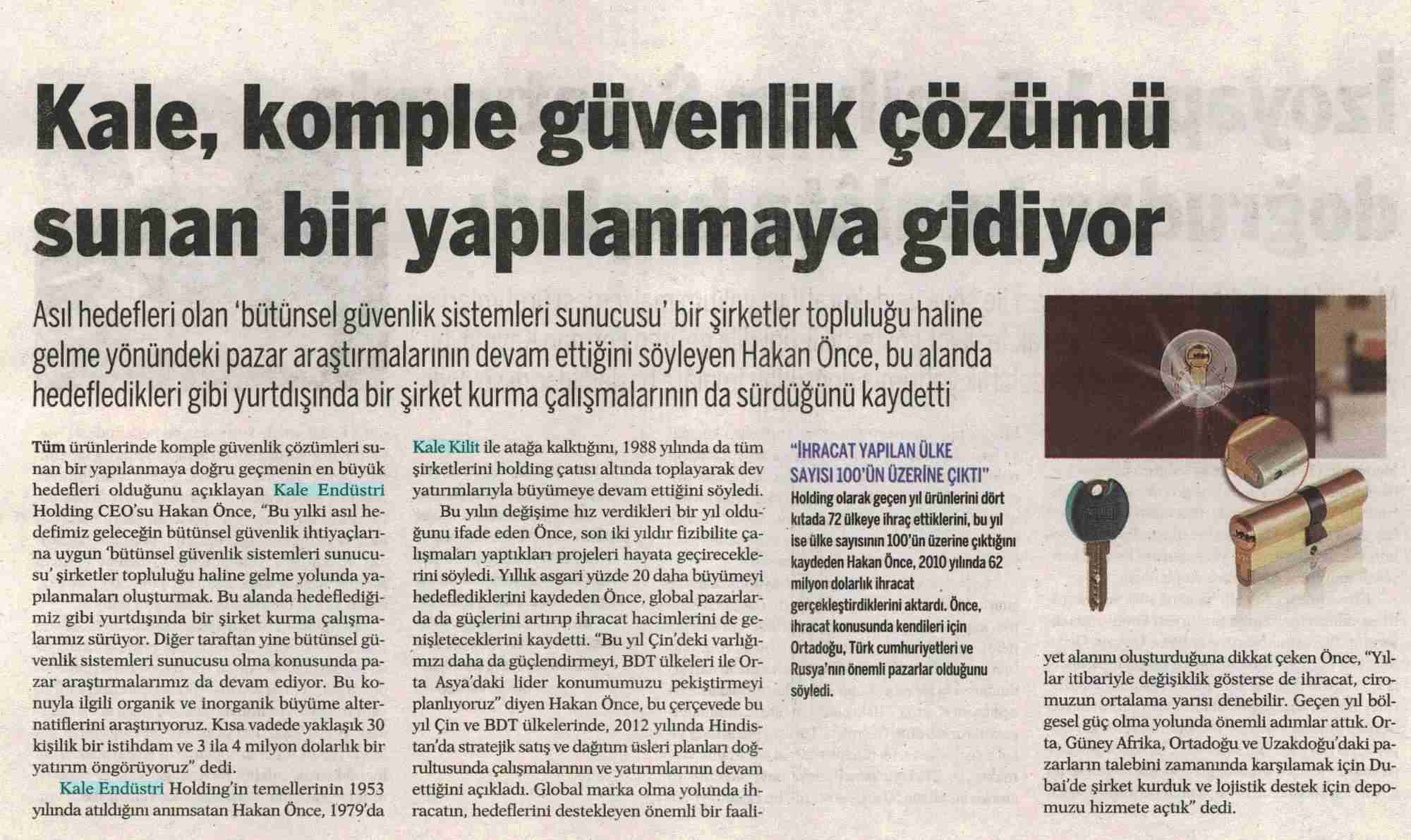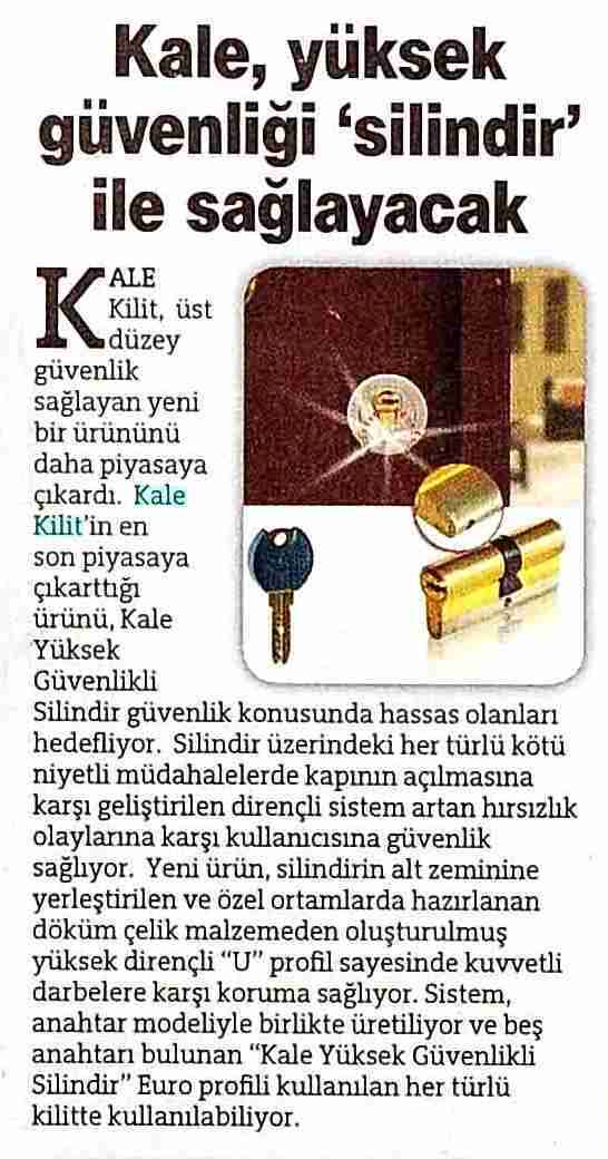Kale, yüksek güvenliği silindir ile sağlayacak Hürriyet Seri İlanlar 16.07.2011