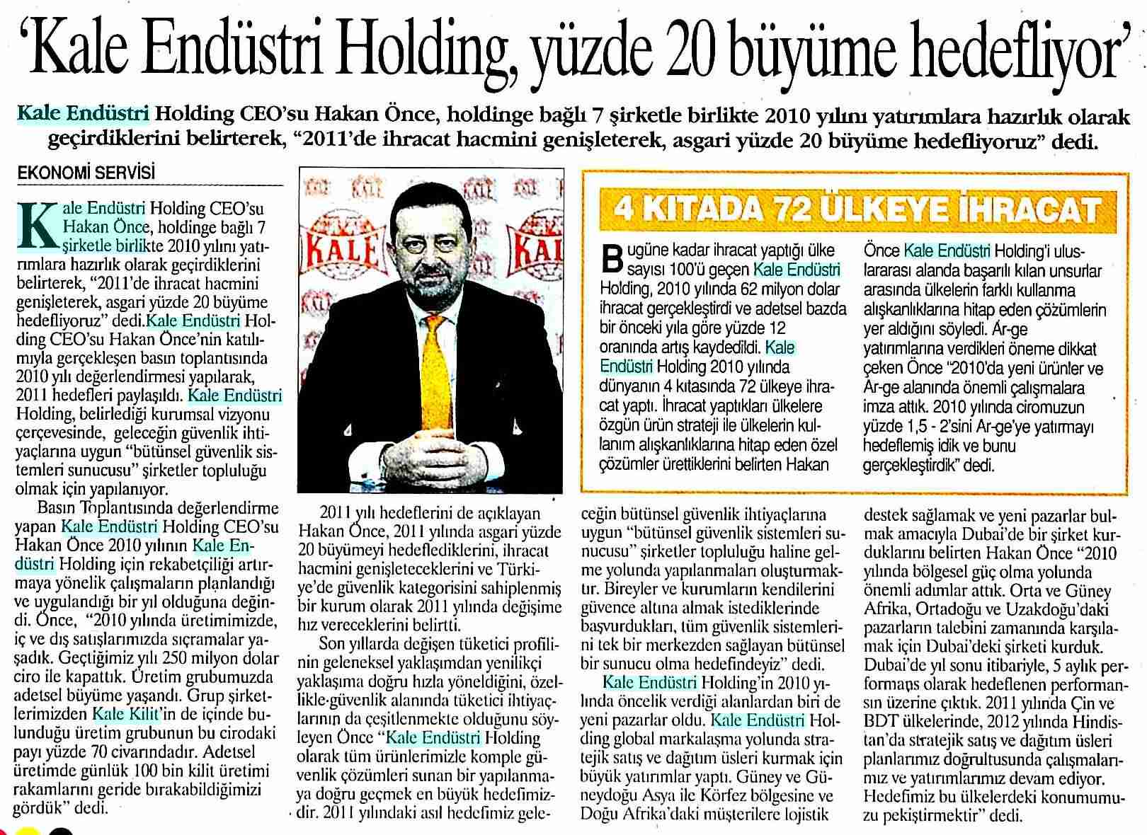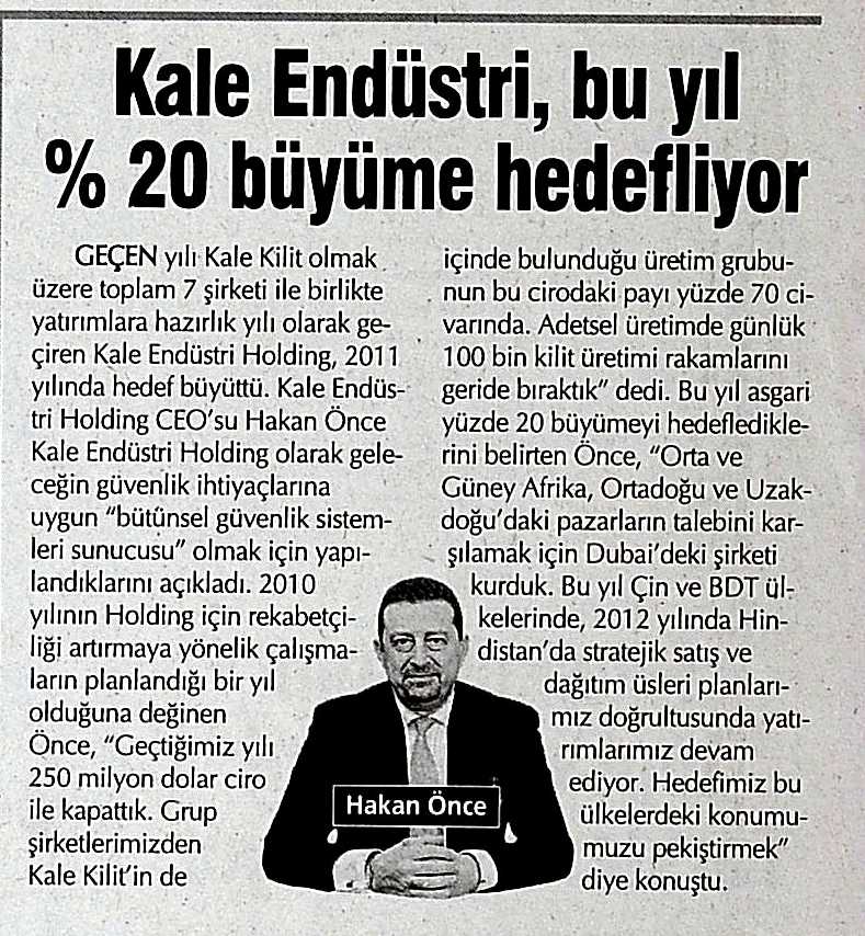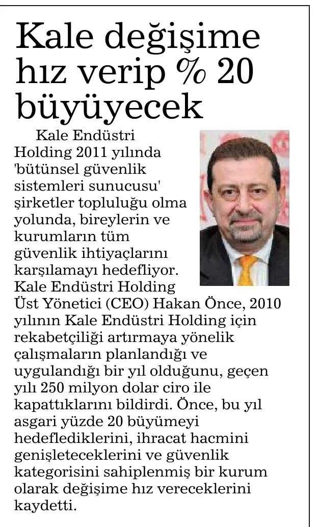 Kale Endüstri %20 büyüme hedefliyor. Vatan 19.03.2011