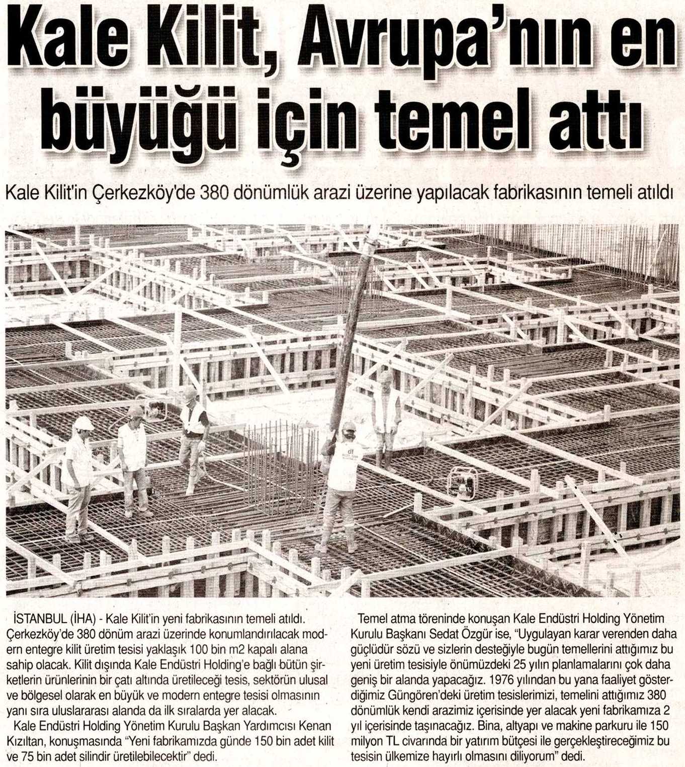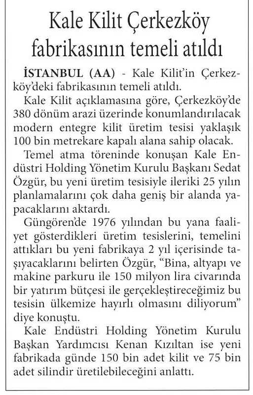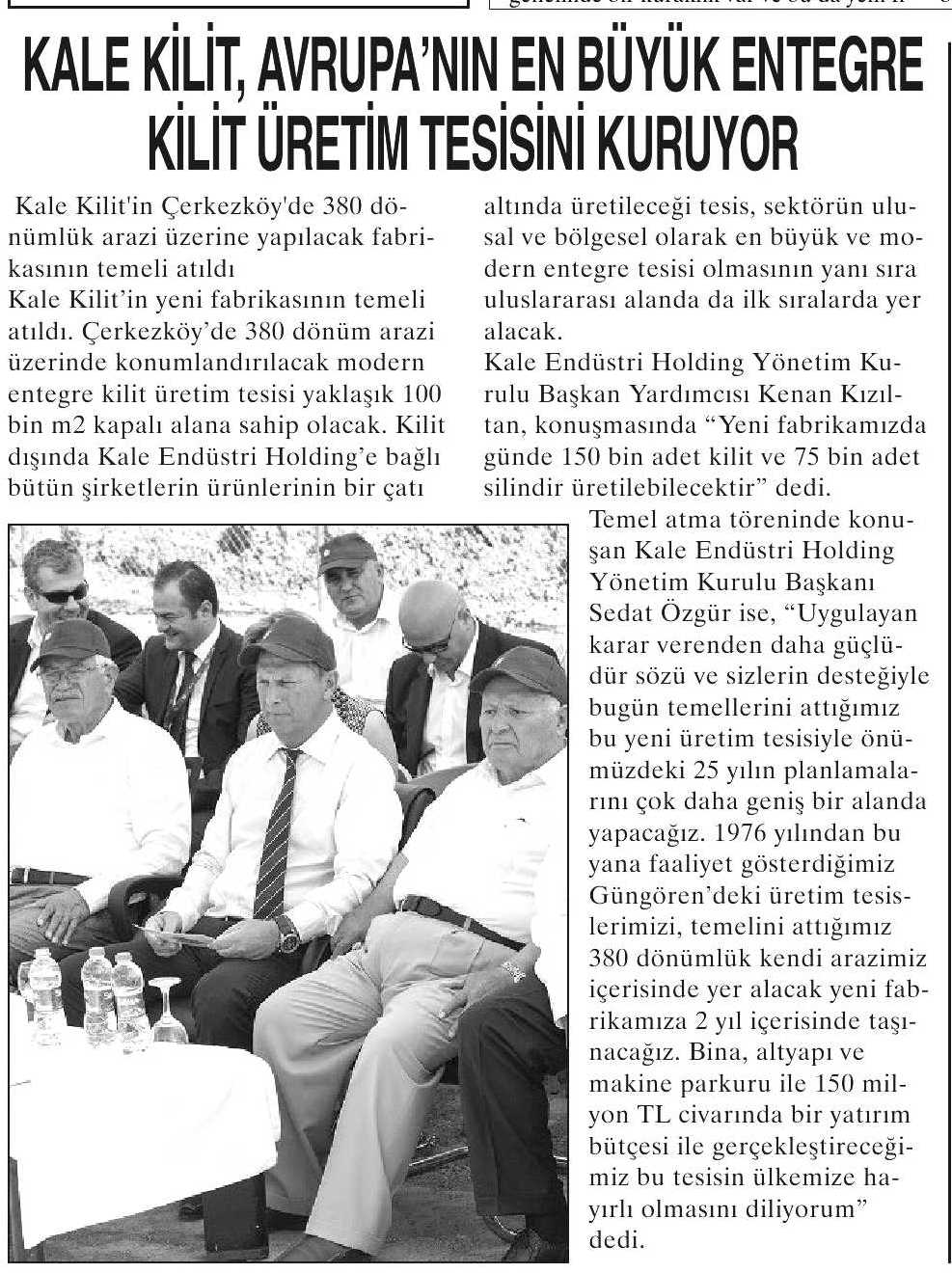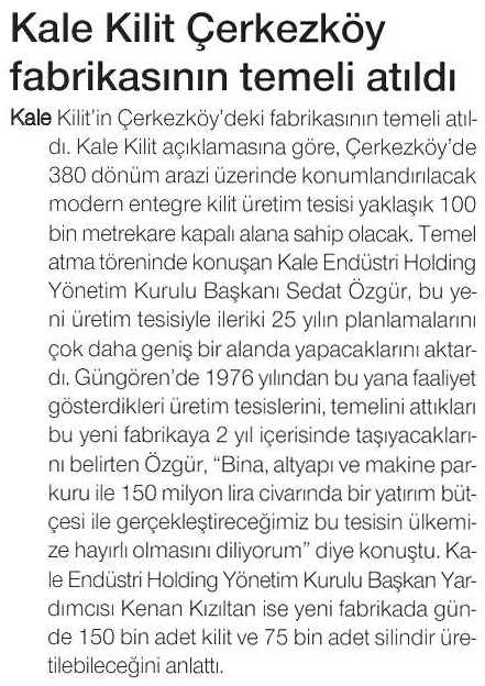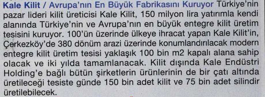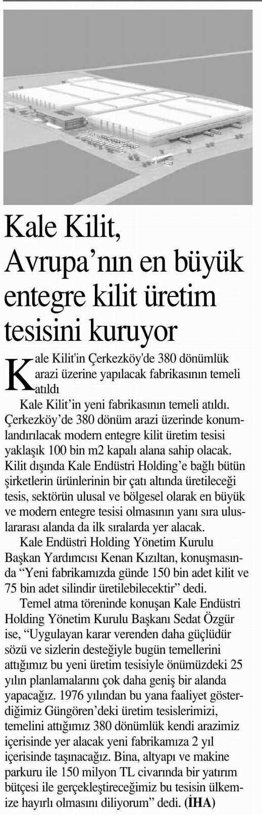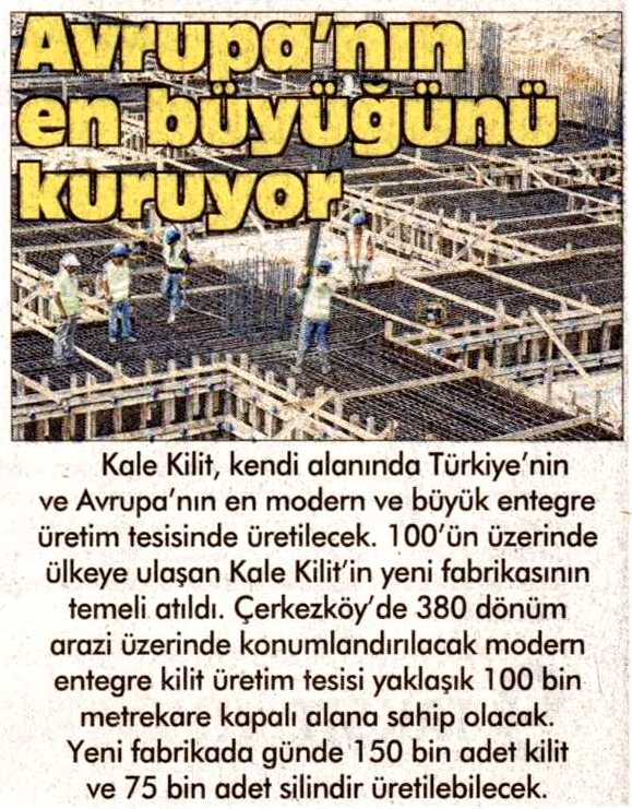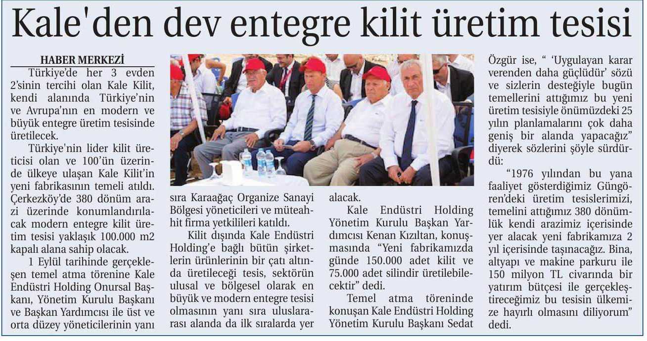 Kale'den dev entegre kilit üretim tesisi Ticaret Gazetesi (İzmir) 06.09.2014