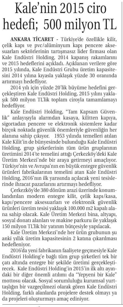 Kale'nin 2015 ciro hedefi: 500 milyon TL Ticaret Gazetesi (İzmir) 19.01.2015