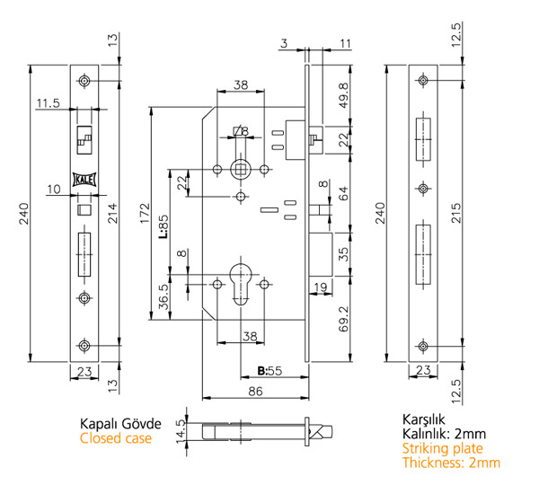 OTOMATİK KİLİTLEMELİ SİLİNDİRLİ GÖMME KİLİT (GENİŞ TİP) MANDAL VE SÜRGÜ OTOMATİK KİLİTLEMELİ. AHŞAP KAPILAR İÇİN.