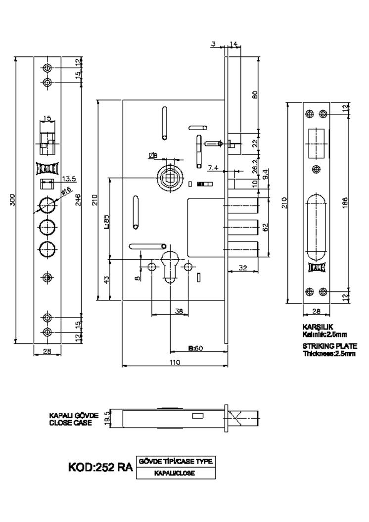Sürgü: Çelik. Üç milli. Krom kaplamalı. Tek turlu.
