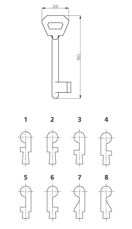 Anahtar:Özel zamak döküm. Pirinç kaplamalı.8 farklı profil.166 AR, 166 ARM, 266 P kilitleri için.